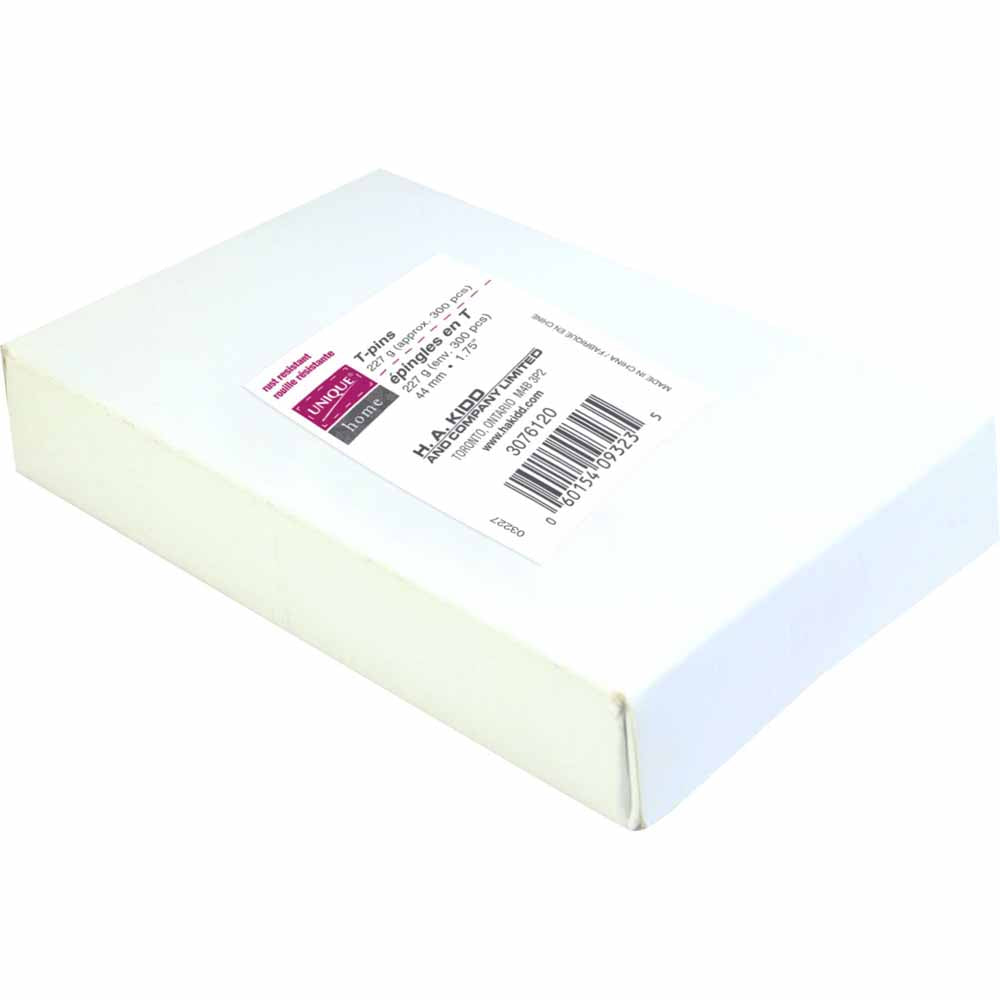 Bulk pack of nickel‑plated, tempered‑steel T‑pins for sewing, crafting and blocking. The rigid 44 mm length holds heavy or loosely woven fabrics, upholstery and canvas securely on boards or foam without bending. T‑shaped heads are easy to grasp and align for precise layouts. A workroom staple for blocking knitted pieces, positioning patterns, and anchoring fabric layers during construction or display.