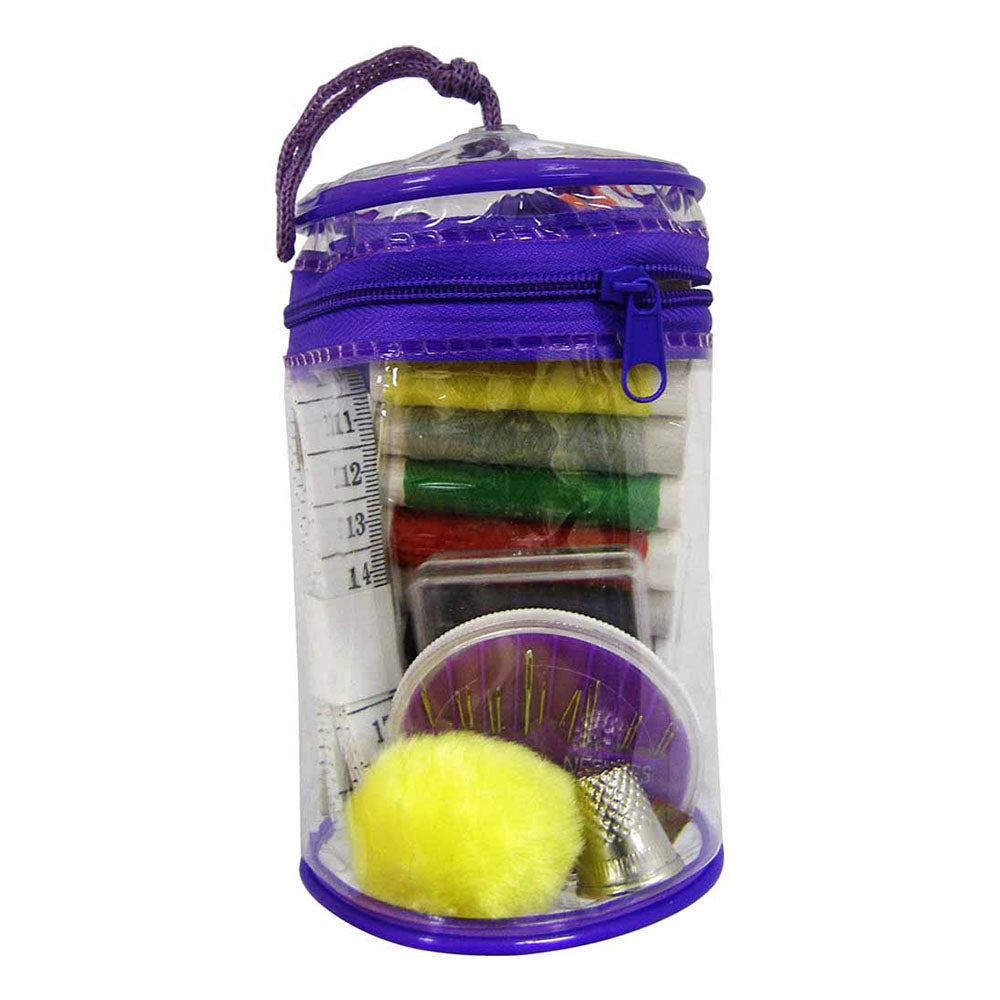 Compact everyday kit stocked for quick mending and travel. Includes 1 thimble, 1 needle threader, 1 pair of scissors, 1 pincushion, 1 tape measure, 1 needle compact, 2 hooks & eyes, 6 safety pins, 6 shirt buttons, 6 snap fasteners, 10 spools of thread and 10 straight pins. Keep at home, in a dorm, or in a suitcase for on‑the‑spot repairs, hemming and small craft tasks—everything you need for basic fixes in one tidy set.