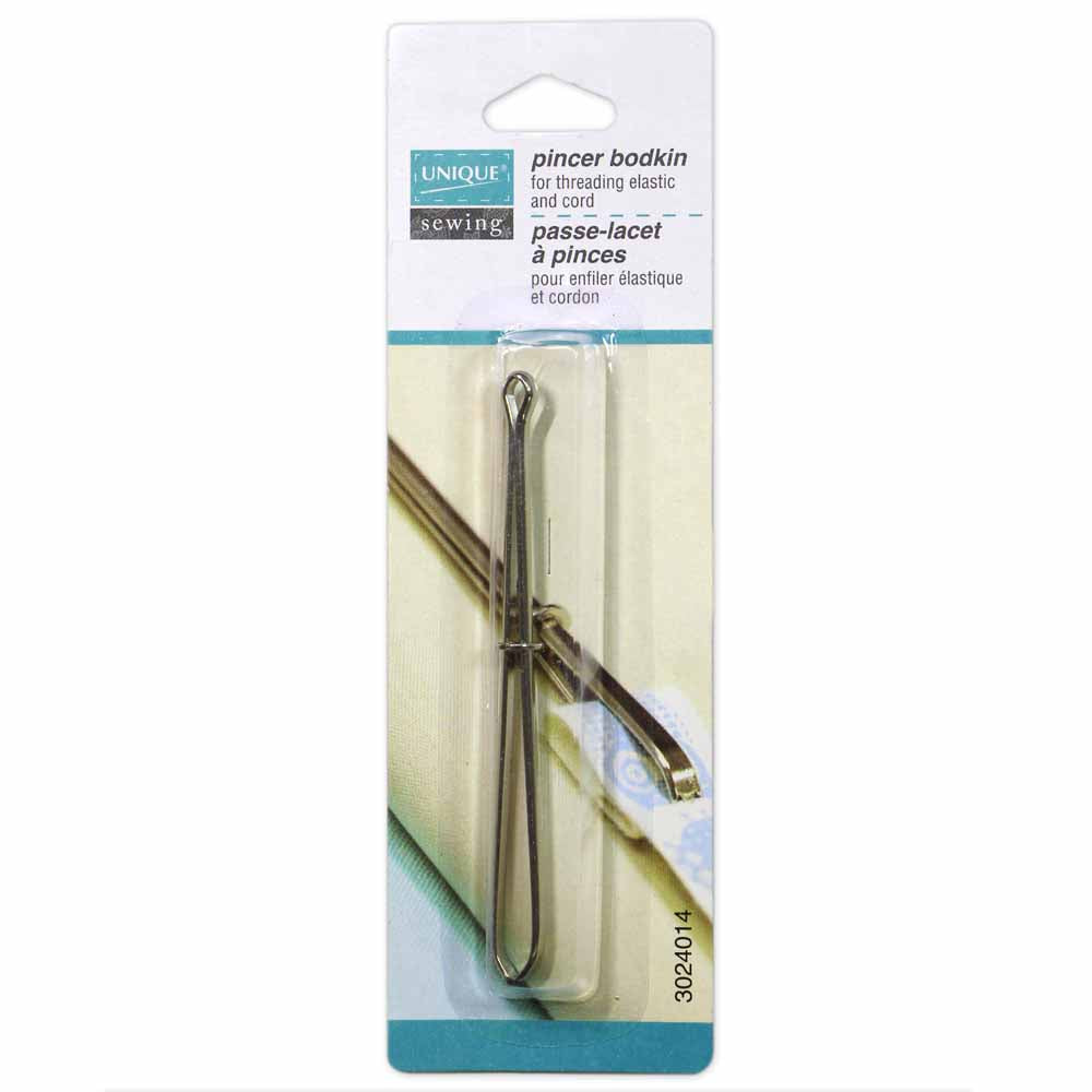 Versatile threading tool with spring‑action jaws that grip elastic, cord, ribbon or trim so you can pull them smoothly through waistbands, hoods and bag casings. The slim profile and rounded tip reduce snagging, while the sliding ring locks material securely as you guide it through tight passages. An essential addition to any sewing kit for apparel, accessories and home‑decor projects that use casings or drawcords.