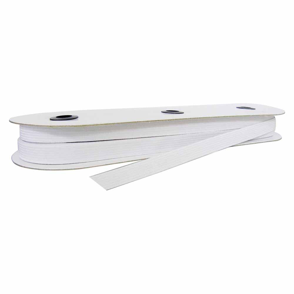 General‑purpose braided elastic for everyday sewing and craft projects. The braided construction offers reliable stretch and recovery and naturally narrows when extended, so it performs best inside a casing rather than stitched through. Supplied on a 27 m (29.53 yd) spool for efficient production. Ideal for waistbands, sleeves and necklines, costume work and repairs. 13 mm (4/8") width; White.