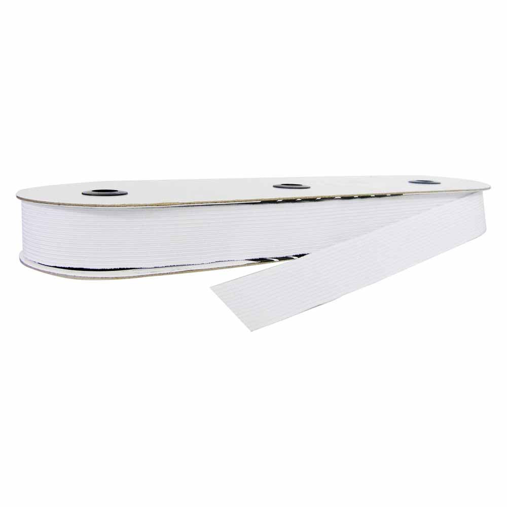 General‑purpose braided elastic for everyday sewing and craft projects. The braided construction offers reliable stretch and recovery and naturally narrows when extended, so it performs best inside a casing rather than stitched through. Supplied on a 17 m (18.59 yd) spool for efficient production. Ideal for waistbands, sleeves and necklines, costume work and repairs. 25 mm (1") width; White.