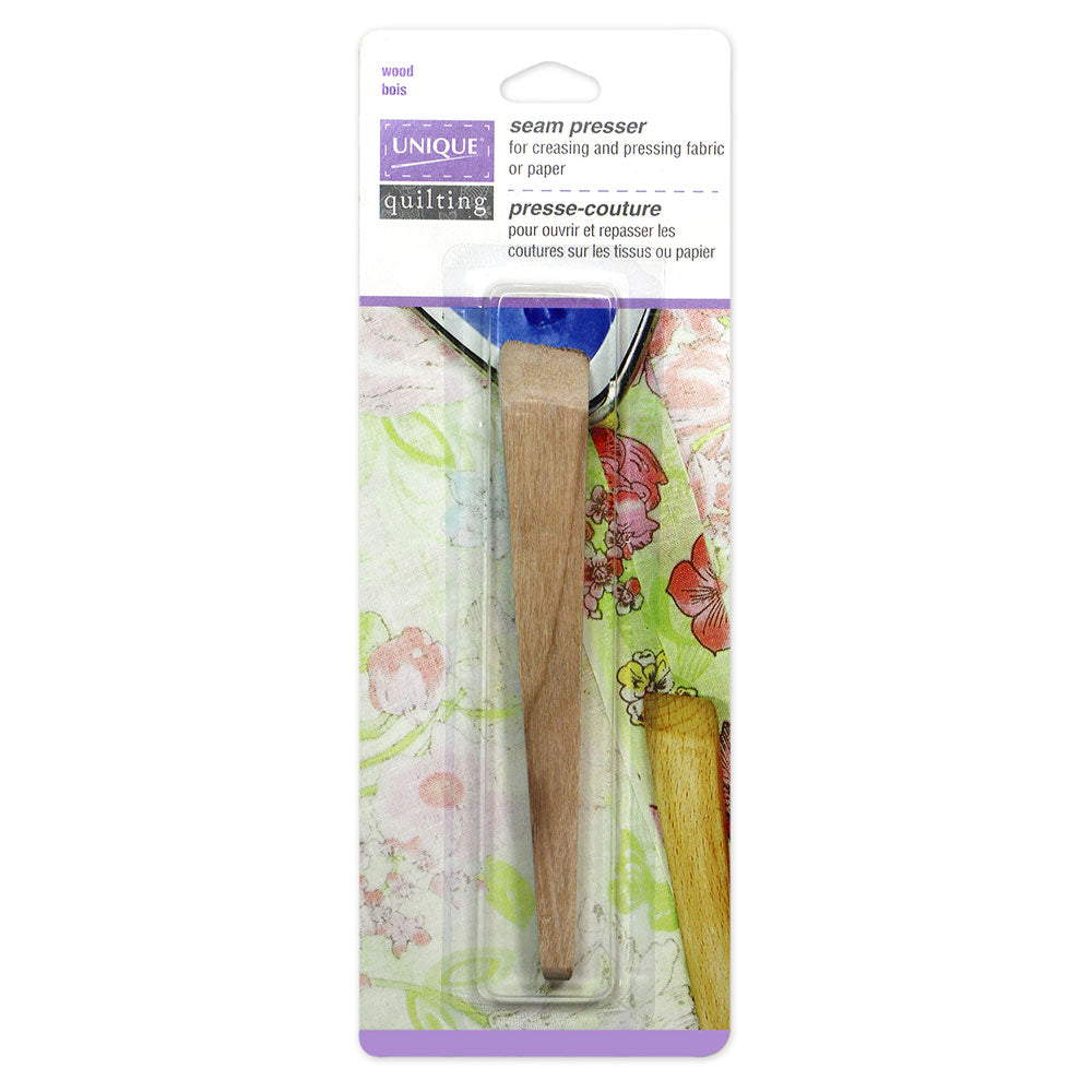 Versatile wooden presser for creasing seams, finger‑pressing quilt blocks and setting folds in fabric or paper. Helpful at the machine for opening seams without heat and for appliqué prep where an iron is impractical. Smooth finished edges glide over fabric to reduce shine and distortion, keeping work accurate. Designed for accurate setup and repeatable results; ideal for classes, guild kits and retail demo bars.